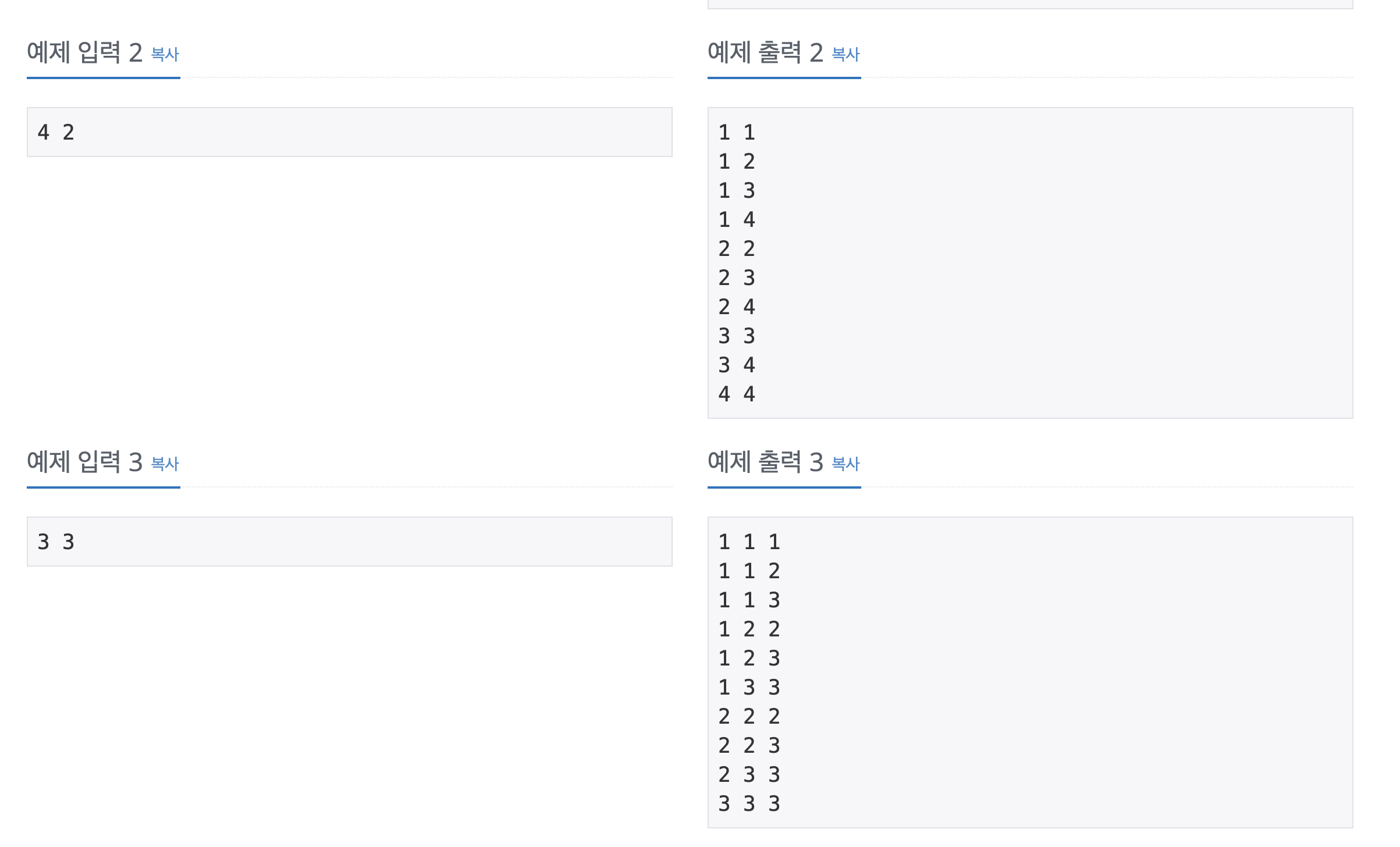한 줄에 하나씩 문제의 조건을 만족하는 수열을 출력한다. 중복되는 수열을 여러 번 출력하면 안되며, 각 수열은 공백으로 구분해서 출력해야 한다. 수열은 사전 순으로 증가하는 순서로 출력해