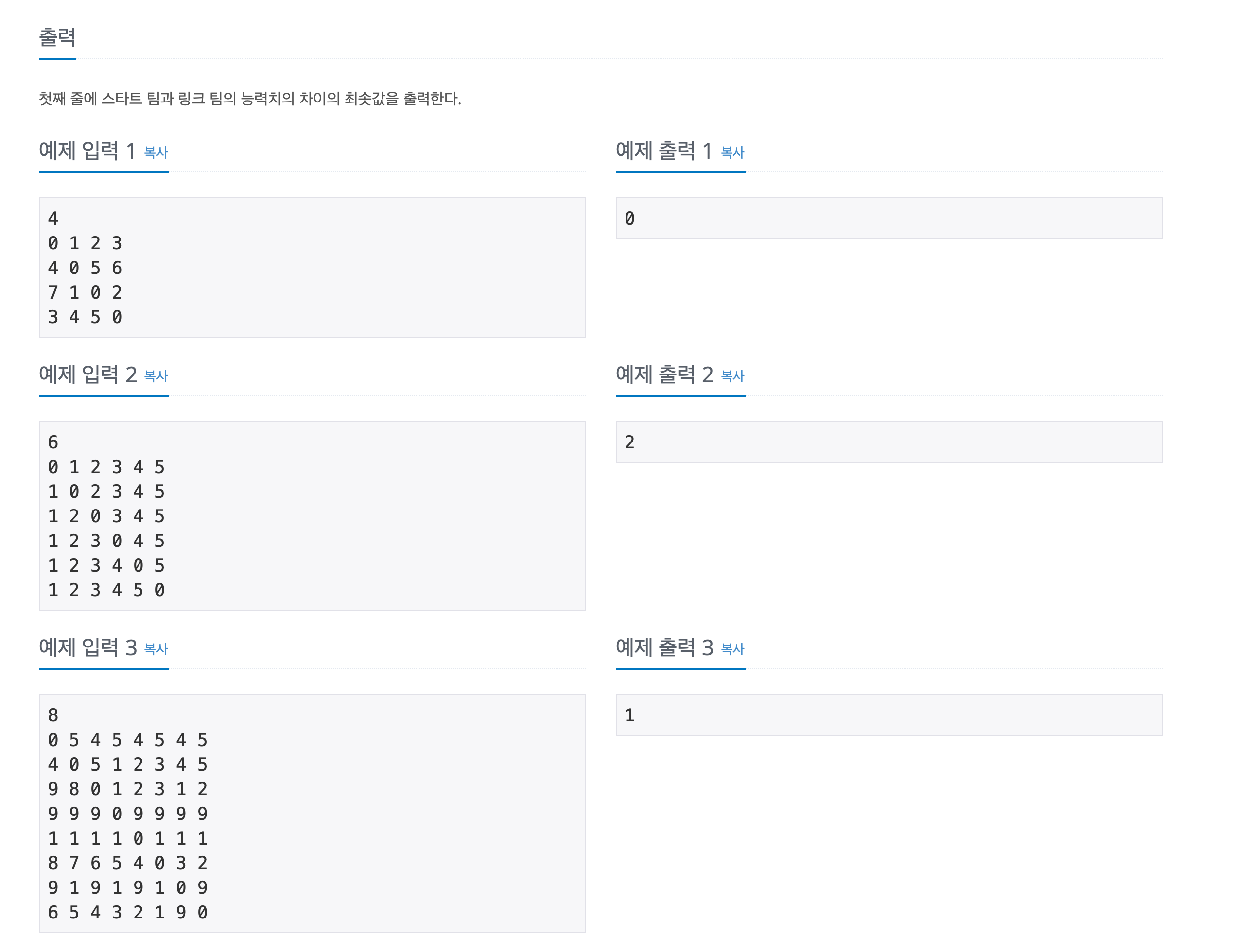 문제는 팀 두개로 인원을 나눈다음 각 팀 mat[1][2] + mat[2][1] 이런식으로 더해서 다른 팀과의 차이를 구한다.