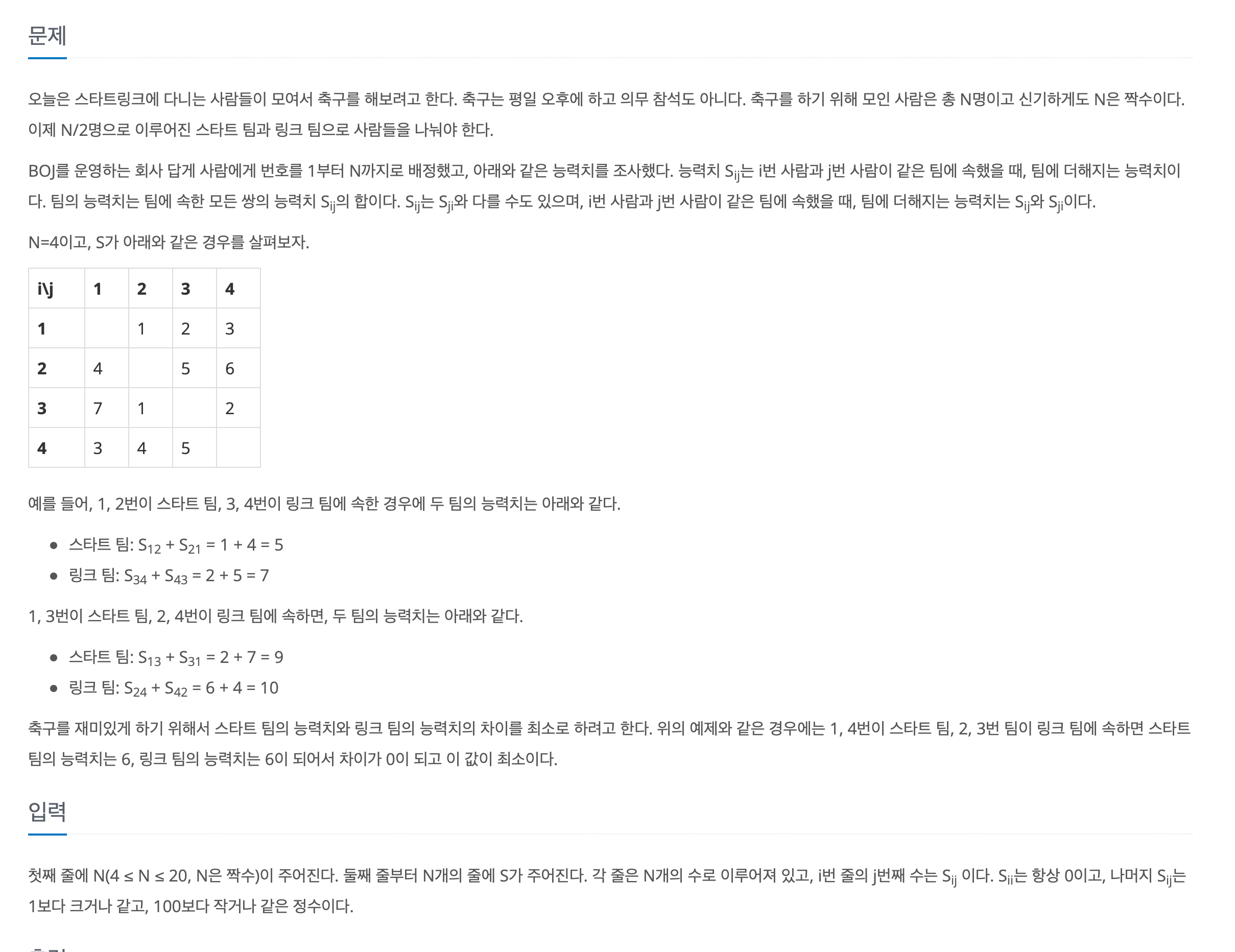 언제쯤 내 스스로 깔끔하게 풀 수 있을까... 문제를 풀 때 a팀 b팀을 나누고 그 나눈 순서대로 더해서 백트래킹을 하면된다는 것 까지는 생각했는데 몇 틱이 부족해서 실패한다.... 더 열심히 해야겠다...