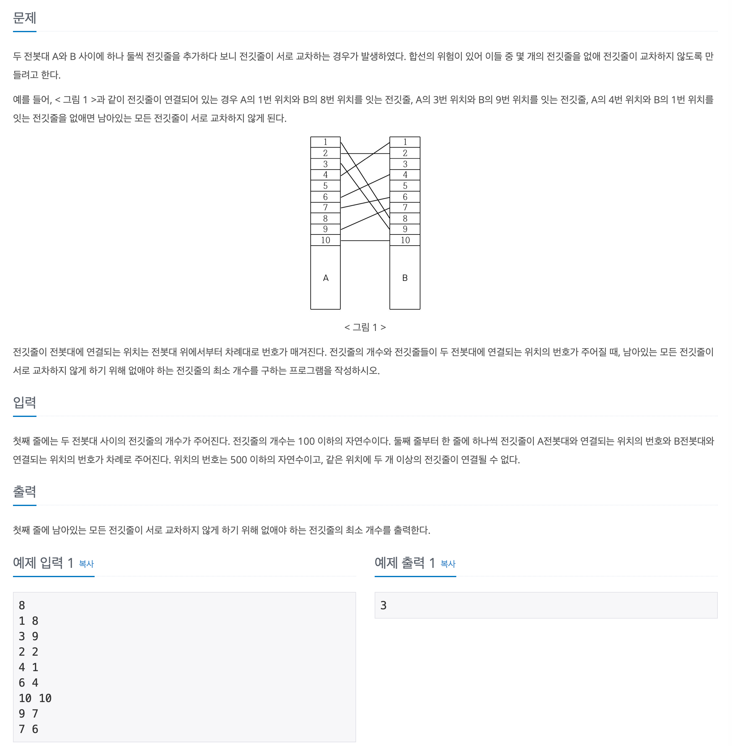 첫째 줄에는 두 전봇대 사이의 전깃줄의 개수가 주어진다. 전깃줄의 개수는 100 이하의 자연수이다. 둘째 줄부터 한 줄에 하나씩 전깃줄이 A전봇대와 연결되는 위치의 번호와 B전봇대와 연결되는