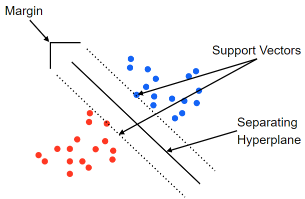 그림에서 보듯이 결정경계와 가장 가까운 포인트들을 Support Vector 라고 하고 바로 그 선을 기준으로 클래스 사이의 거리를 Margin이라고 한다.