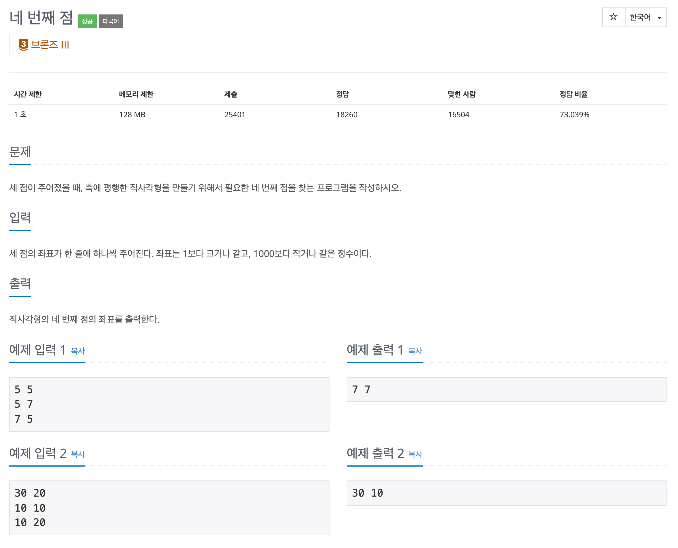 [Python] 백준 알고리즘 온라인 저지 3009번 : 네 번째 점 Python3 코드 x_nums = [] y_nums = [] for _ in range(3): x, y = map(int, input().split()) x_nums.append(x) y_nums.append(y) for i in range..