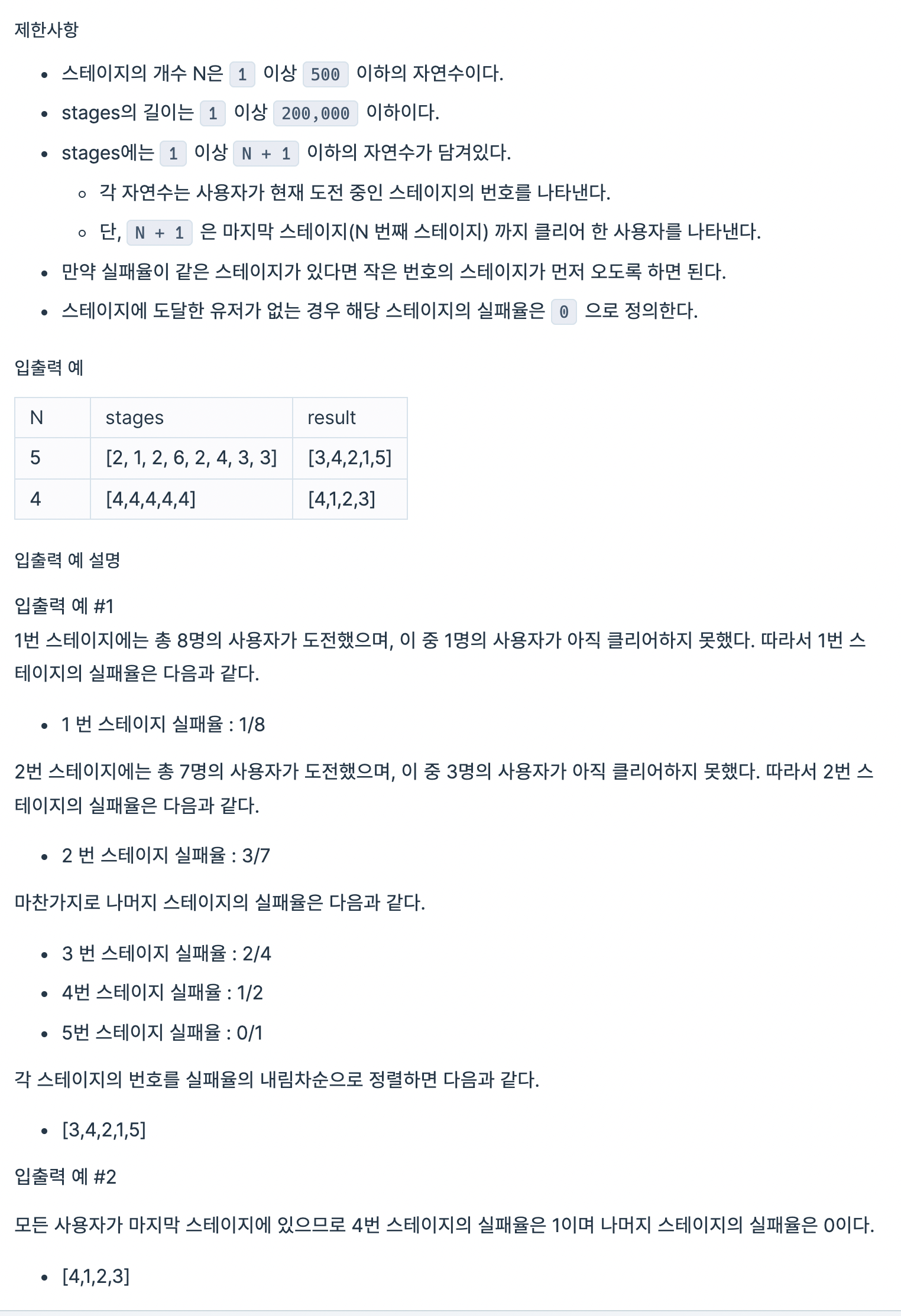 fail_ratio 를 dict로 받아오고 사람의 수가 0이면 fail_ratio를 0으로 설정한다. 이것의 답은 [i]고